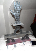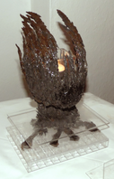 Material: Eisenpulver (ca.90%), starke Magnete (ca.5%), (Festigungs-, Bindungs-, und Aushärtungsstoffe (ca.5%). Und dann noch ein bisschen Metallfarbe :) Stand: Holz Entstehungsjahr: 2018 Grösse: Phönix an sich: Flügel zu Flügel: ca. 50cm; Anfang Kopf bis Phönix-Ende unten: ca. 45cm; äußerste "Schwanzfeder" hinten bis äßerster Bauch vorne: ca. 30cm. Vom äußersten obersten Rand d. vogels bis zum Holzstand ganz unten: ca. 140cm