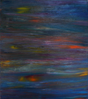 Über das Werk: Dieses rein in Blautönen gehaltenen Gemälde stellt eine schemenhafte Gestalt dar, die sich gebückt fortbewegt. Die frisch wirkenden Farbtöne reichen von arktisch blau bis zu dunklem Cyan. Aufgetragen wurden sie in verschiedenen Mustern, doch überweigt eines das an ein Geflecht verschiedener Stränge erinnert. Umrandet bleibt all dies von einer weißen Freifläche, die neben der Signatur enigie Graphitmarkierungen enthält.