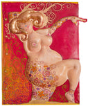 Über das Werk: Dreidimensionaler, weiblicher Akt in warmen roten Tönen auf blau-lila Rahmen gespannt.