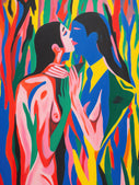 Über das Werk: Dieses Gemälde ist eine Hymne an eine geheime, leidenschaftliche Liebe. Versteckt in einem Meer aus stilisierten Grashalmen, entfaltet sich der intime Kuss eines Paares. Der Stil erinnert an die emotionale Farbgebung des Fauvismus und die klare, aber ausdrucksstarke Linienführung des Post-Impressionismus. Die leuchtend gelben und orangenen Töne im Hintergrund erzeugen eine fast mystische, emotionale Atmosphäre, die das Paar in ein schützendes Licht der Geborgenheit hüllt. Es ist ein Kunstwerk, das die Poesie der versteckten Augenblicke zelebriert, die Natur als Zeugin der tiefen Verbundenheit inszeniert und jedem Raum eine Aura von Wärme, Energie, Liebe und Intimität verleiht.