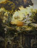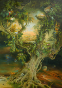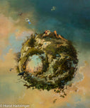Über das Werk: Als Kind habe ich sehr gerne die Märchen von Rübezahl gelesen. Und da gibt es die Geschichte, in der Rübezahl die Prinzessin in die Unterwelt entführt. Auf einmal landen sie dort in einer wunderschönen Landschaft mit blühenden Wiesen und Sonne. Ich dachte mir, wie geht das jetzt weiter? Die sind doch gerade in den Untergrund abgetaucht, wieso ist da der Sonnenschein und wieso sind da blühende Wiesen? Also muss es in der Welt drinnen noch mal eine Welt geben. Das war ein Gedanke, der mich seit meiner Kindheit beschäftigt und mich nicht mehr losgelassen hat. Diesen Gedanken habe ich in diesem Bild umgesetzt.