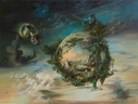 Über das Werk: Die hier verarbeitete Erinnerung geht zurück auf einen Ausflug mit meinen Eltern. Ich habe unterwegs in irgendeinen Abgrund geguckt und mir dabei etwas zusammenfantasiert, was natürlich gar nicht vorhanden war. Diese Vorstellung hat mich seitdem immer wieder beschäftigt: dass sich auf einer untergegangenen Welt eine neue Welt aufbaut. Diesen Gedanken habe ich in einem Bild umzusetzen versucht.