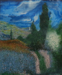 Über das Werk: Blumen und Wolken sind die schönsten Worte der Natur. Das ließ mich mit Buntglas experimentieren, diese Worte mit Farbe in Epoxidharz zu erhalten.