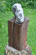Über das Werk: Der Kopf der Skulptur ist 27 cm hoch, der historische Holzbalken mit Stahlplatte ist 124cm hoch. Der Holzbalken ist mit einem Ammonit gekennzeichnet.