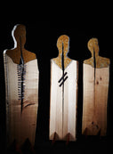 Über das Werk: Einfach und schlicht, dennoch königlich. Die Schieferköpfe, gefasst in gespaltenen Buchenstehlen, veredelt mit Glaskronen, geben den Skulpturen ihre Grundform. Das Blattgold verrät den Prunk und die Pracht der Könige.
