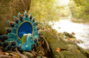 Über das Werk: Ein Zimmerbrunnen mit türkis-blau-weißer Glasur.