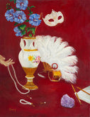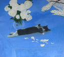 Über das Werk: Ich beobachte gerne die Katzen. Sie geben viel Freude in unserem Leben. Deswegen entscheidete ich eine Serie von Katzen zu malen. Ich zeige einen kurzen Moment. Das Bild strahlt nach guter Stimmung durch leuchtende Farbe und ungewöhnliche Komposition.
