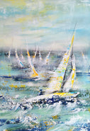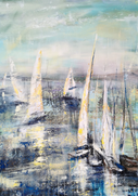 Über das Werk: Die Serie Wasser und Segelboote ist für mich eine Symbiose aus Dynamik, Kraft aber auch gleichzeitig Freiheit und Frieden. Mich fasziniert das Zusammenspiel des Windes, amorpher Wasserformen und die ästhetische Geometrie des Segelbootes.