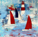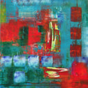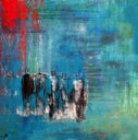 Über das Werk: Collagen (Stoff, Leinen, Gewebe) auf mehrfach mit Acrylfarbe gespachteltem und immer wieder durchbrochenen Untergrund, der die einzelnen Farbschichten zum Teil wieder freigibt.