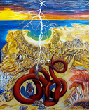Über das Werk: Hathor ist eine altägyptische Gottheit, sie ist das Sinnbild für die Liebe, einer überirdischen göttlichen Liebe. Hathor auf der Reise zeigt, es ist die Liebe unterwegs, wir können Ihr überall und zu jeder Zeit begegnen. Sie ist niemals an einen Ort, eine Person oder eine Zeit gebunden, die wir in Liebe erleben, an einem besonderen Ort, mit einem geliebten Menschen, in einer Zeit des Verliebtsein......Wir können sie nicht festhalten, doch verlieren wir sie auch nicht, solange wir sie in uns selbst tragen. Das Bild ist im Art Deco Stil von Makintosh inspiriert.